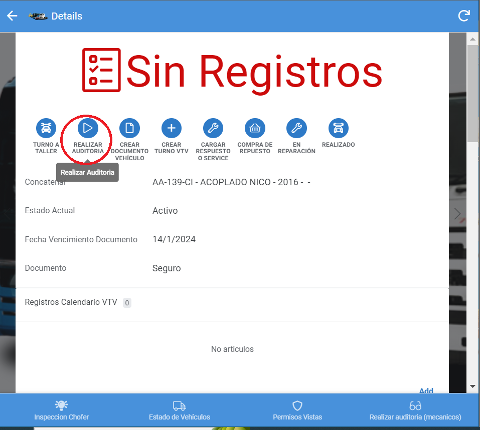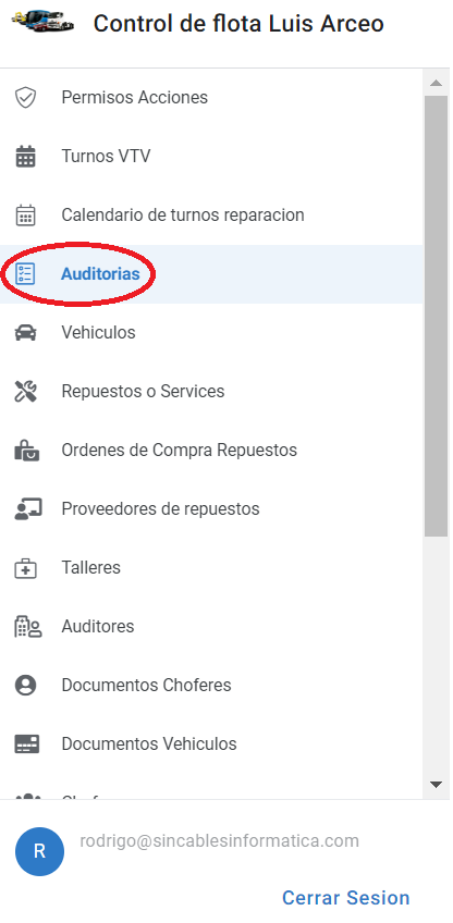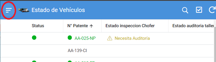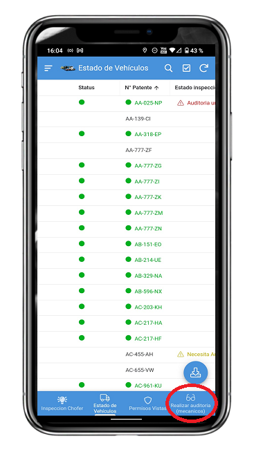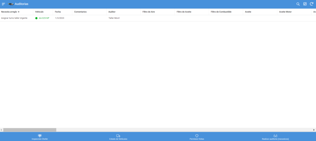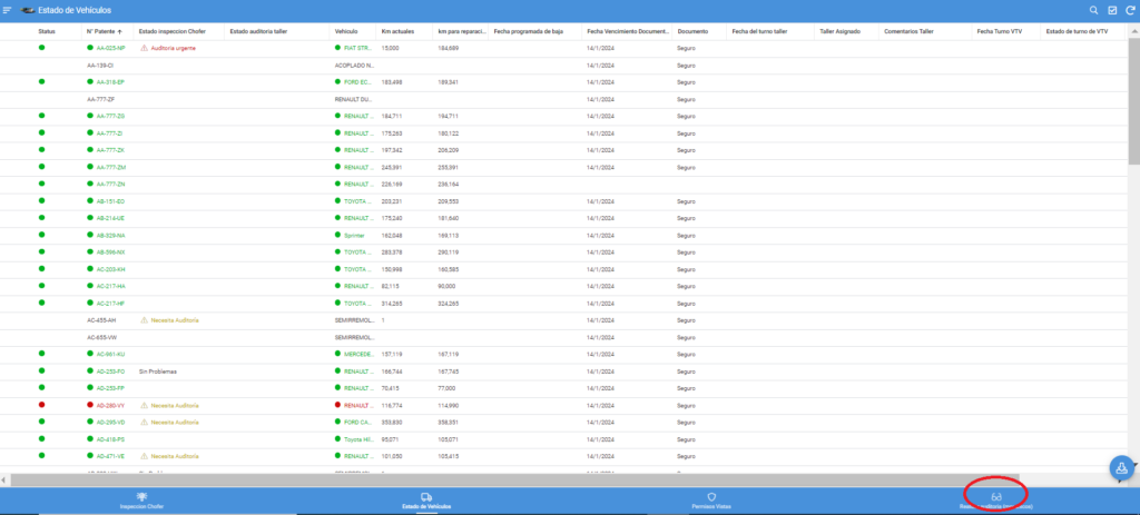 Como realizar una auditoria mecanica en aplicacion “Control de flota” Auditorias Mecanicos Realizar Auditoria (Mecanicos)Se encuentra en la parte inferior derecha de tu pantalla, desde este menu se puede conectar facilmente la carga de una auditoria a un vehiculo. Resumen de auditorias Se encuentra en la parte superior izquierda de tu pantalla, desde este menu señalado con el circulo rojo. Realizar Auditoria (Mecanicos)O ingresando al “EStado de vehiculo”, enconcuentran el boton “Realizar auditoria” Resumen de auditorias Dentro de ese resumen podes filtrar por el nombre de cada columna.